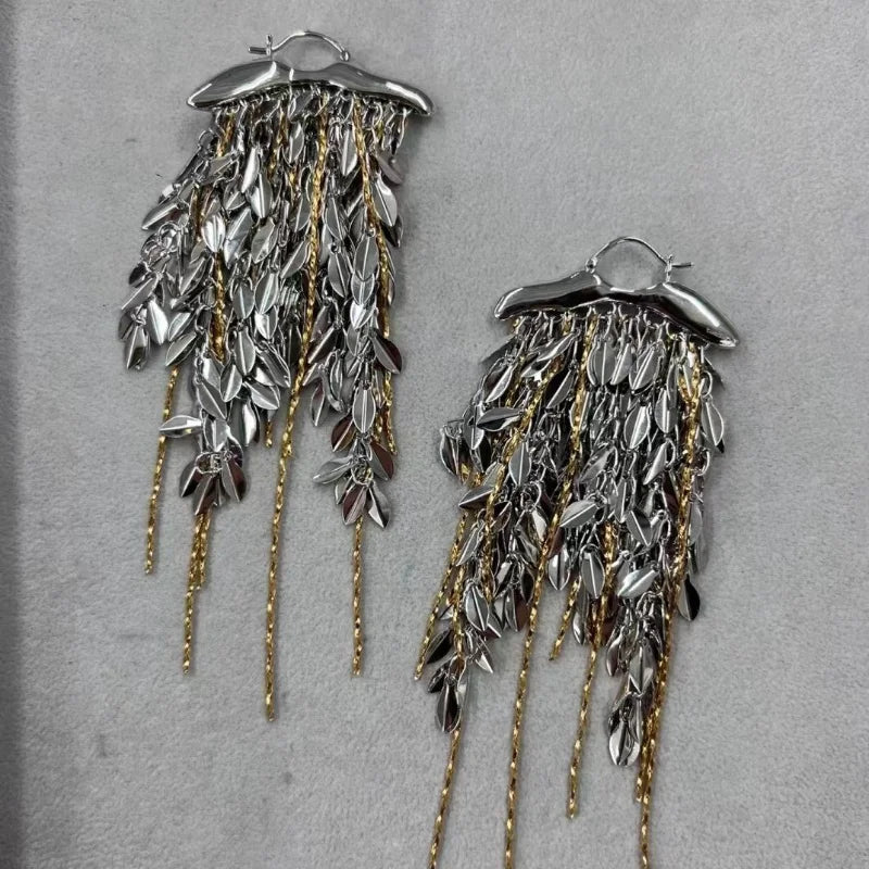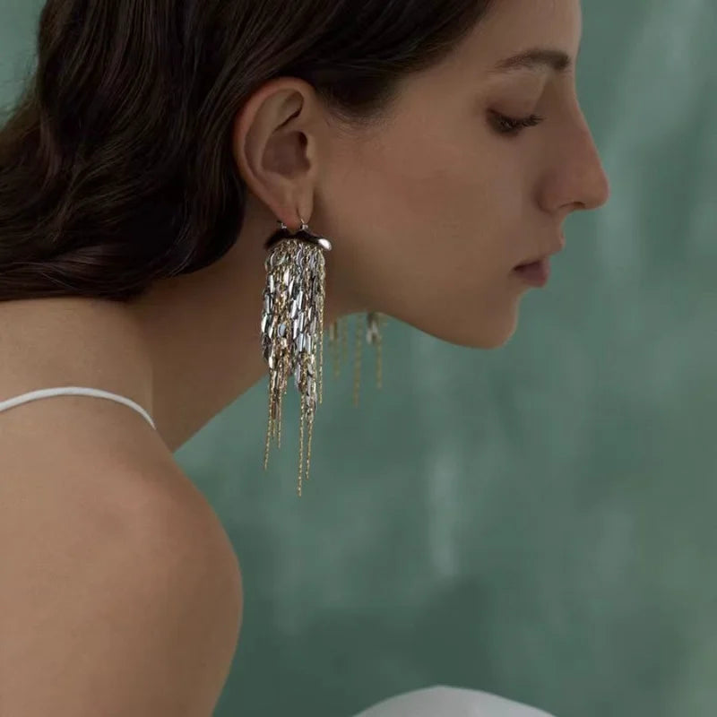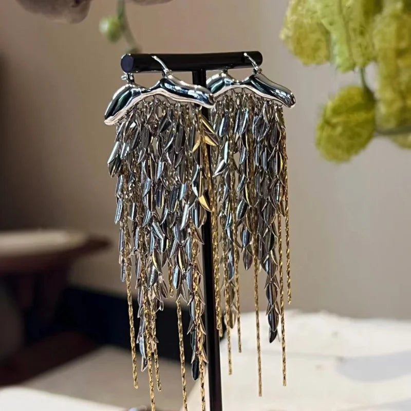 Sylvara unveils a luxe leaf-inspired silhouette with cascading gold-plated chains. Lightweight yet bold, it brings romantic drama to evening wear and statement looks.