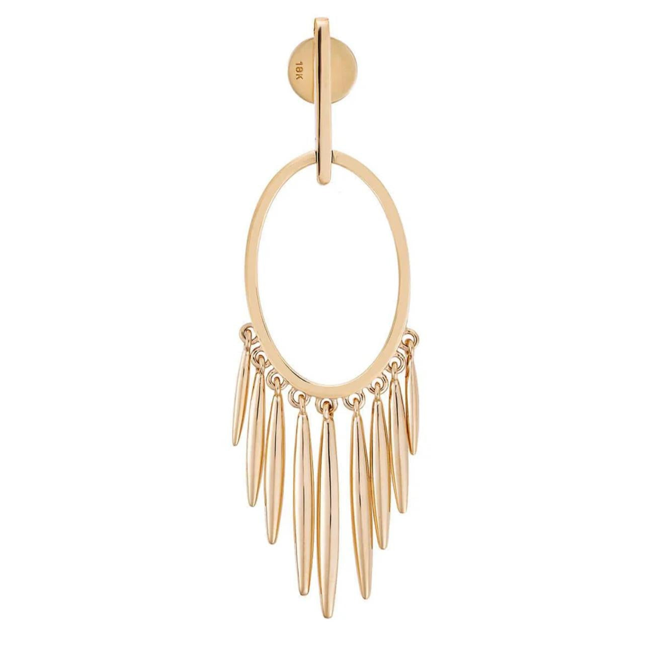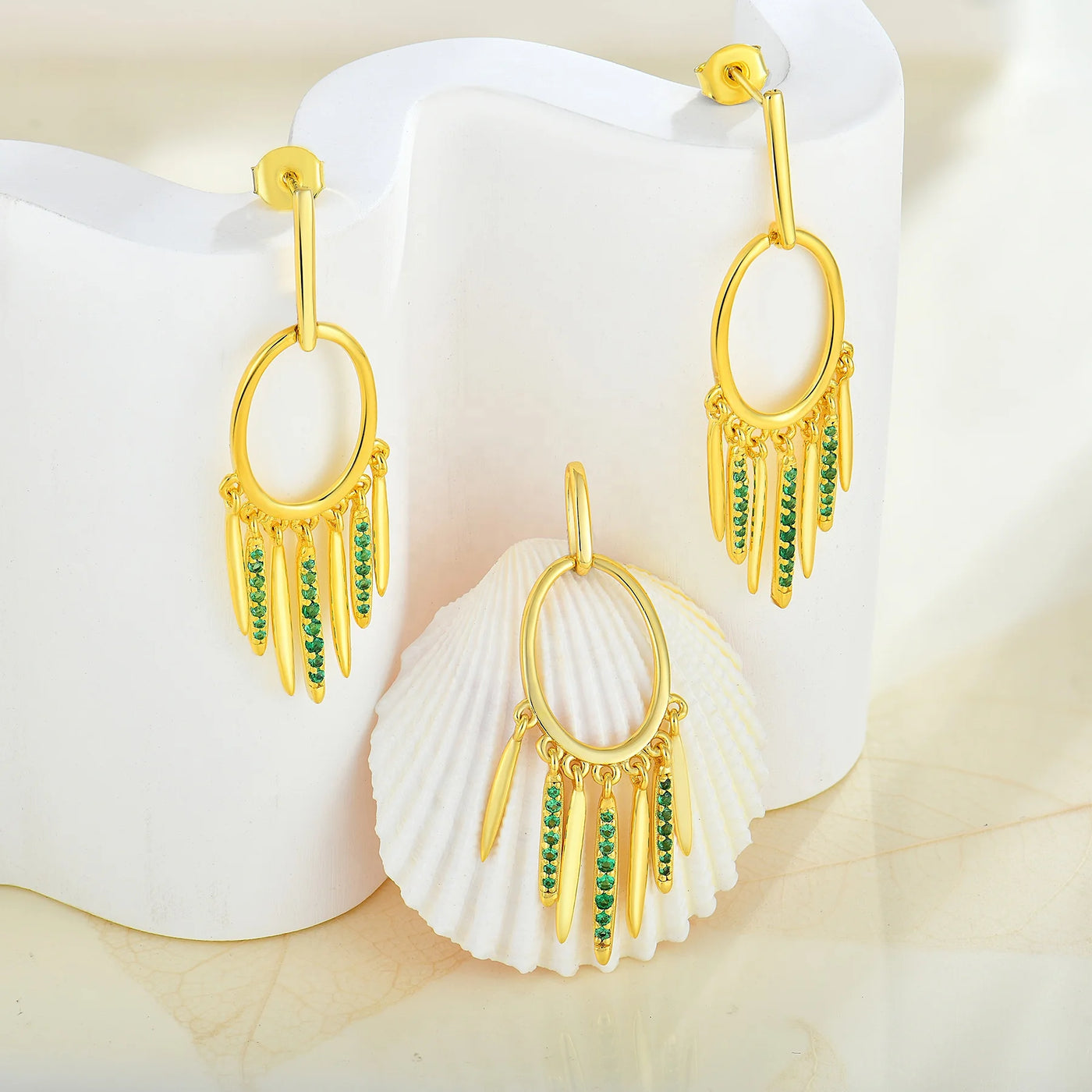 Five golden drops shimmer beneath an open oval silhouette, each lined with vivid emerald-green zircon that adds a breath of fresh, natural radiance.