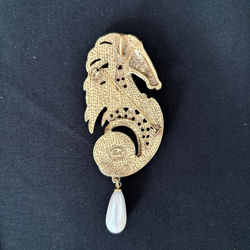 Equinaris embodies the royal court aesthetic with cloisonné enamel details, emerald-green and ruby-red zircon, and twin pearls — a central dome and a free-swinging drop. Boldly crafted, it adds a touch of noble brilliance to coats, gowns, or evening attire.