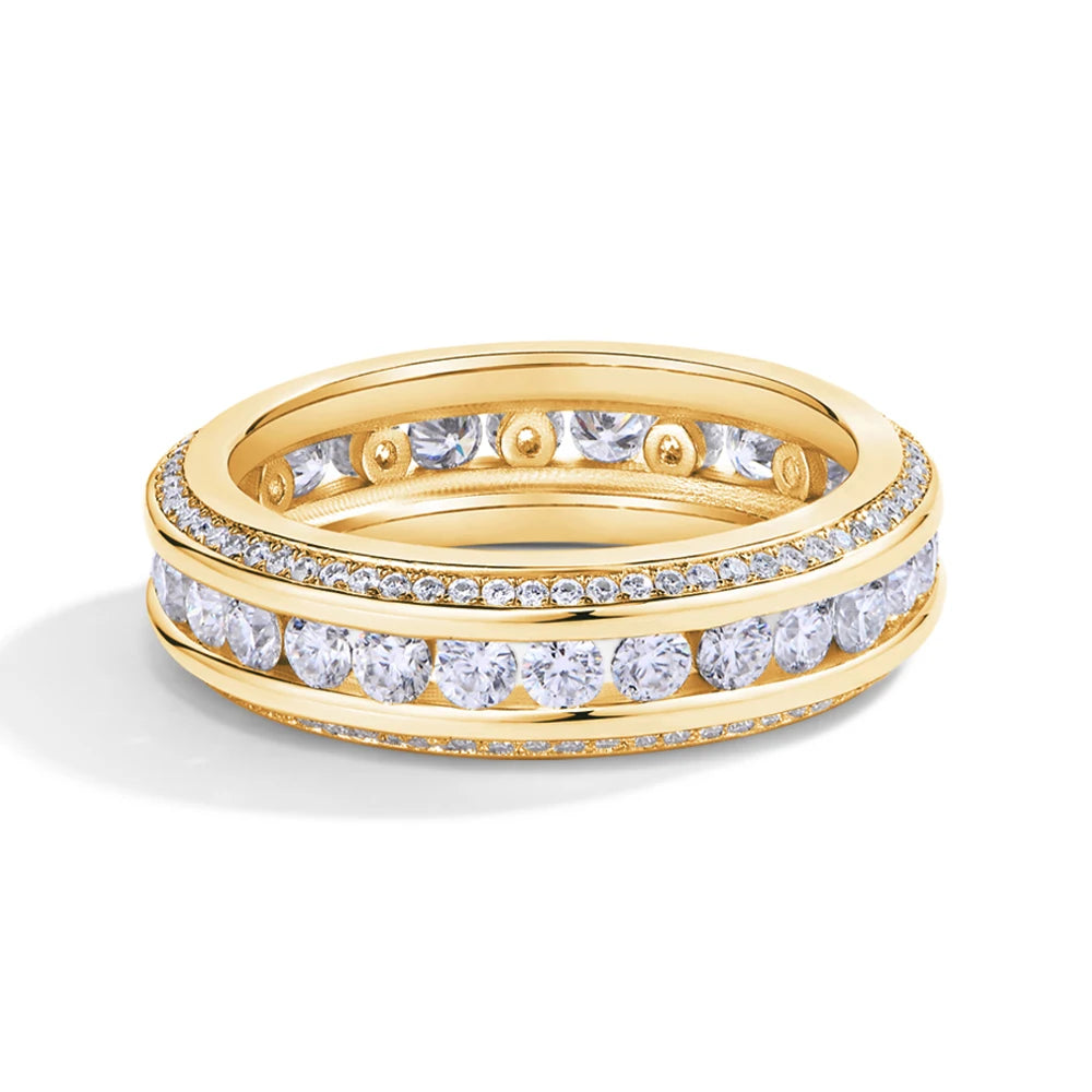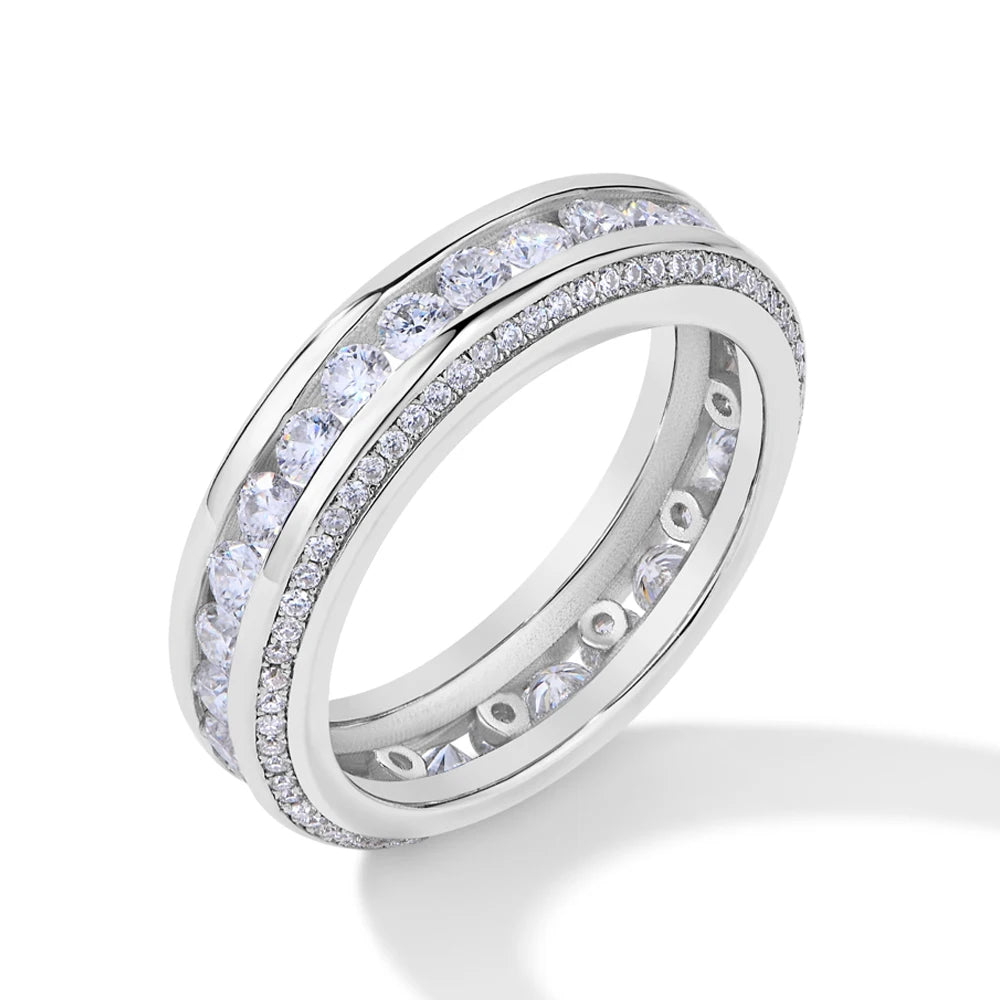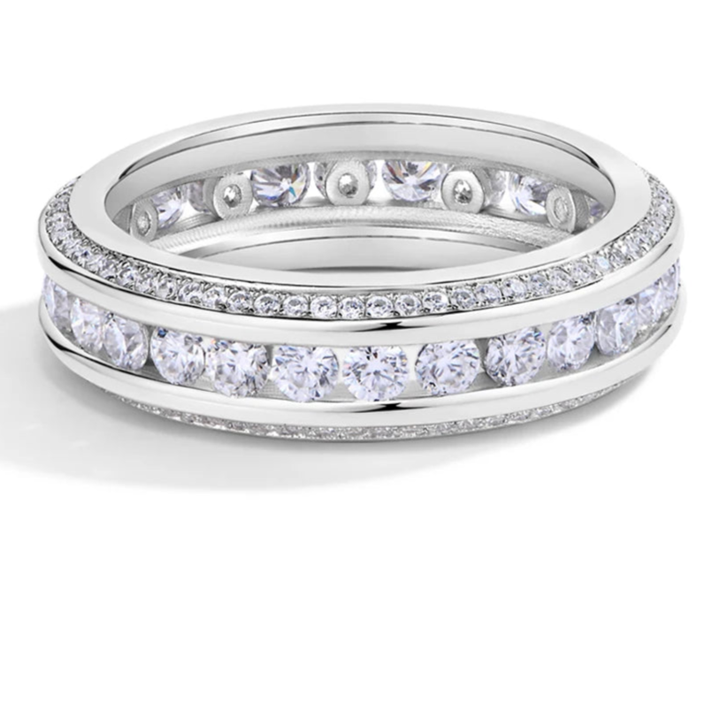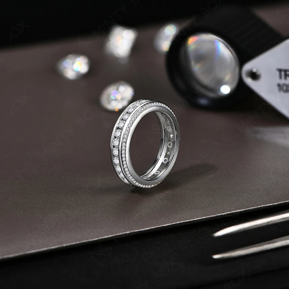 Crafted from solid 925 sterling silver with 18K gold or platinum finish, this eternity band is set with D-color VVS1 moissanite, precision-cut to perfection. At 5.65 g, it is bold yet refined. a ring that celebrates timeless radiance and everlasting elegance.