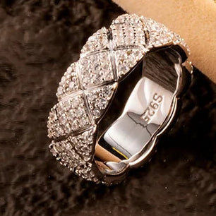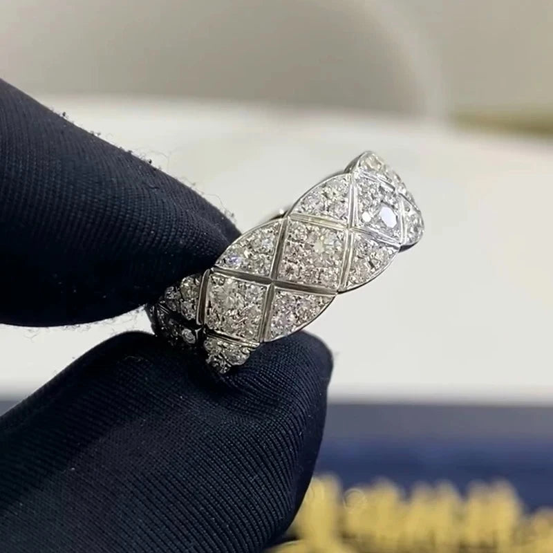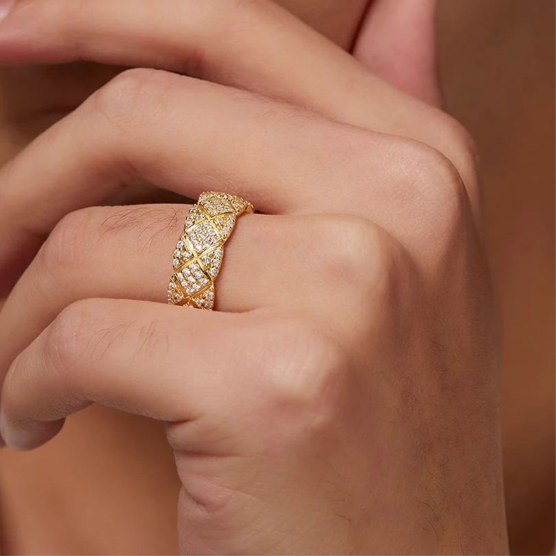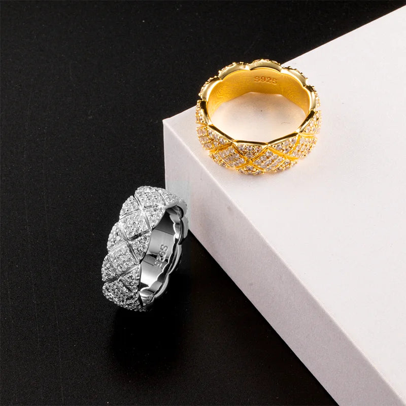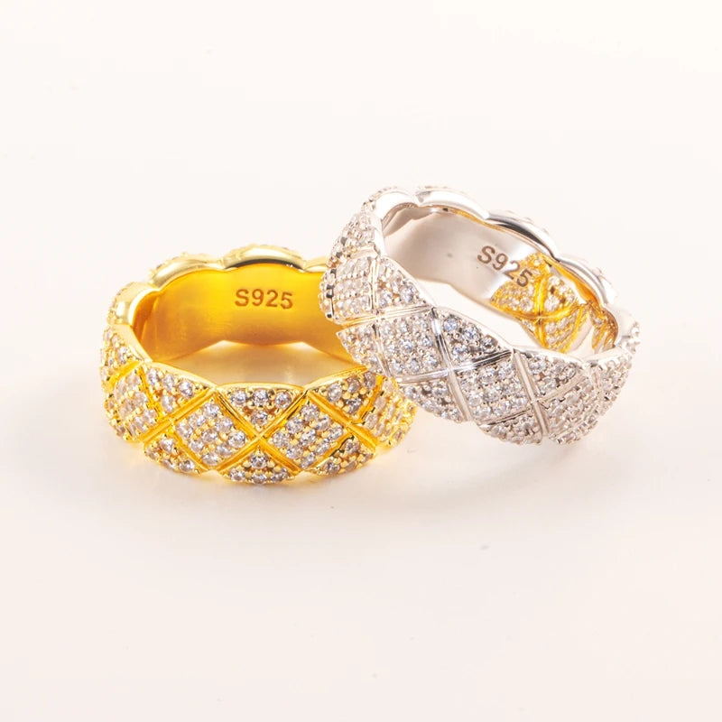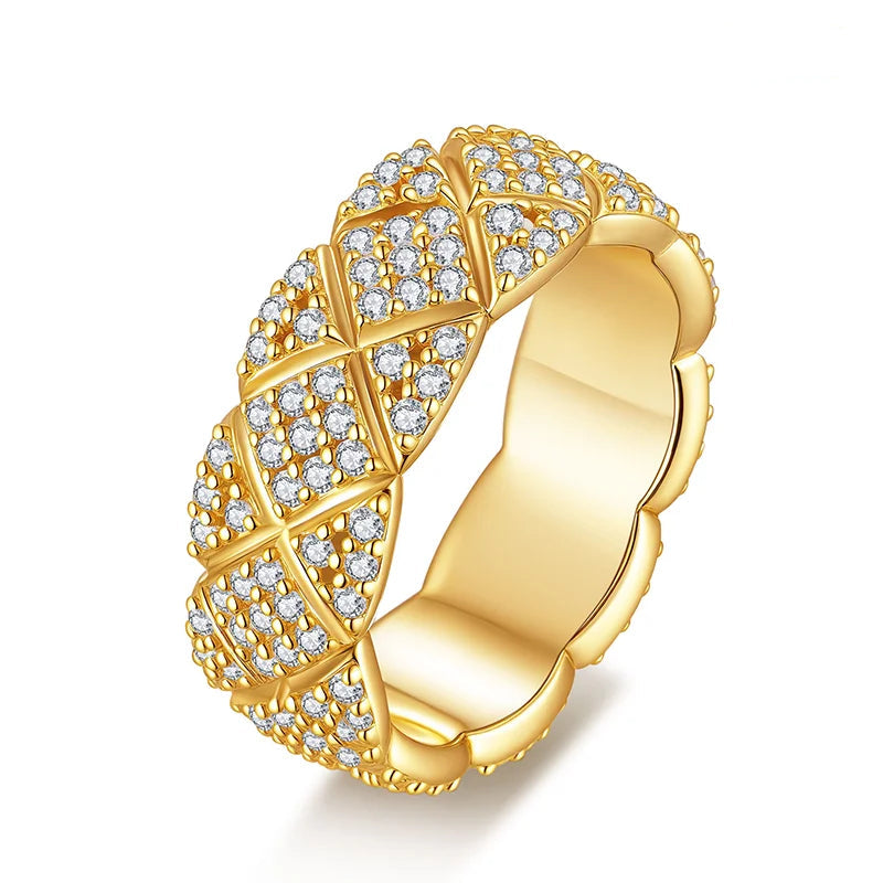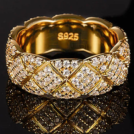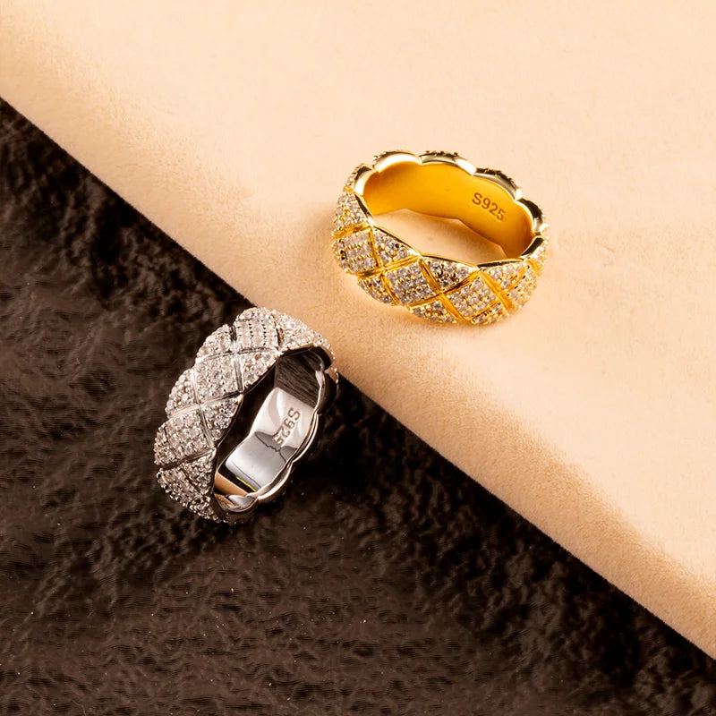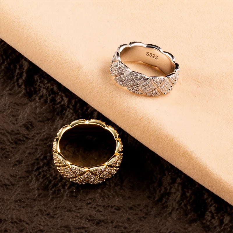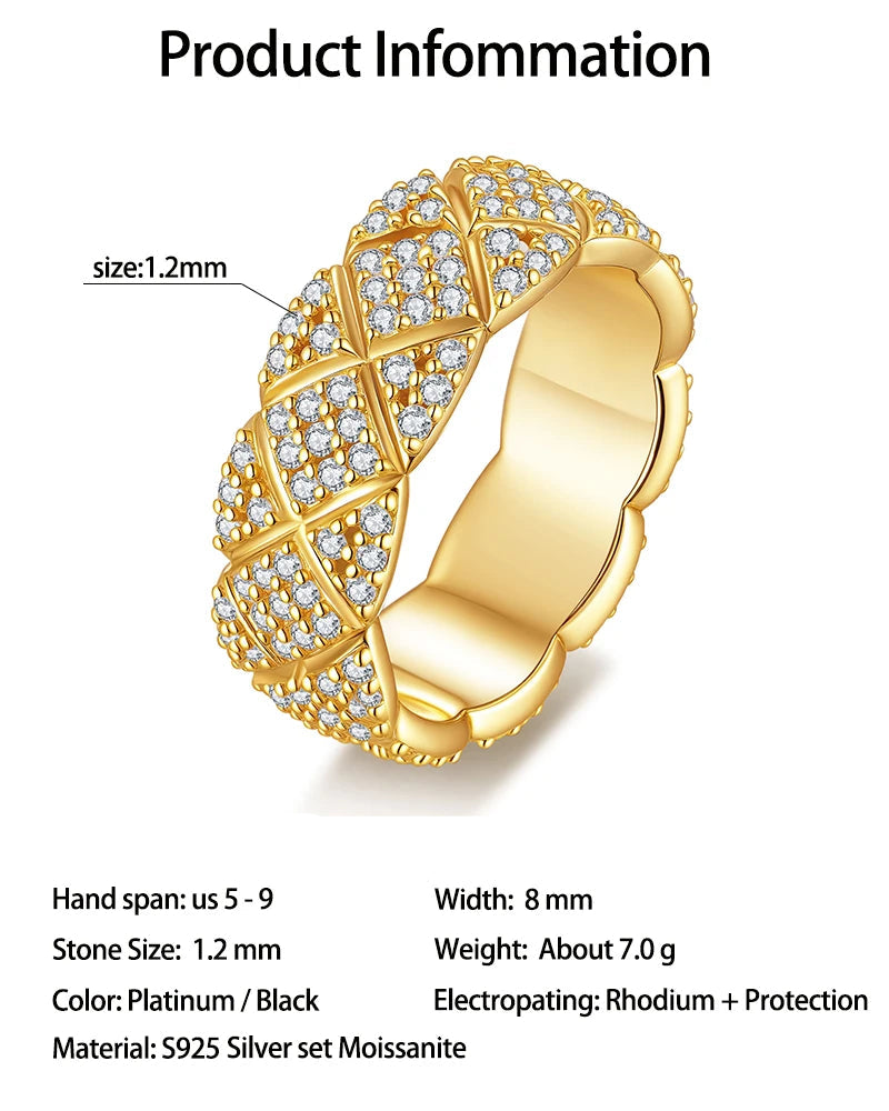 A quilt-pattern pavé band crafted from solid 925 sterling silver, plated in 18K gold or rhodium. Set with hand-cut moissanite stones (1.2 mm each, D-color, VVS clarity), diamond-test approved. Bold 8 mm width, ~7 g weight — timeless brilliance with regal presence.