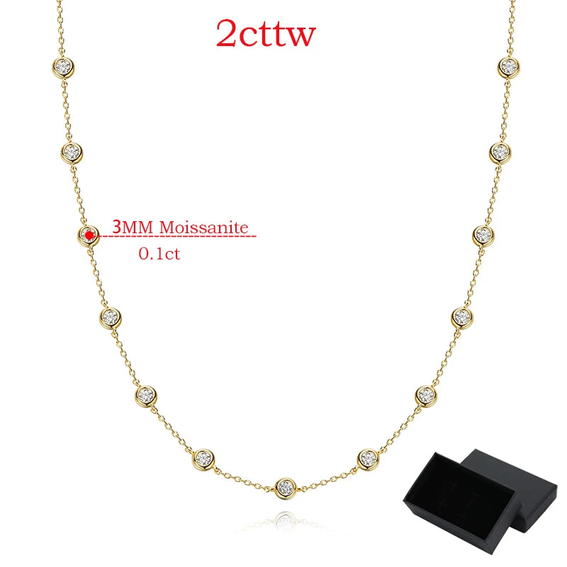 Crafted from solid 925 sterling silver with platinum plating, this tennis necklace features 20 precision-set D-color VVS moissanite stones (2 cttw). Each cut radiates fire, certified to pass the diamond test, an audacious fusion of timeless elegance and modern mastery.