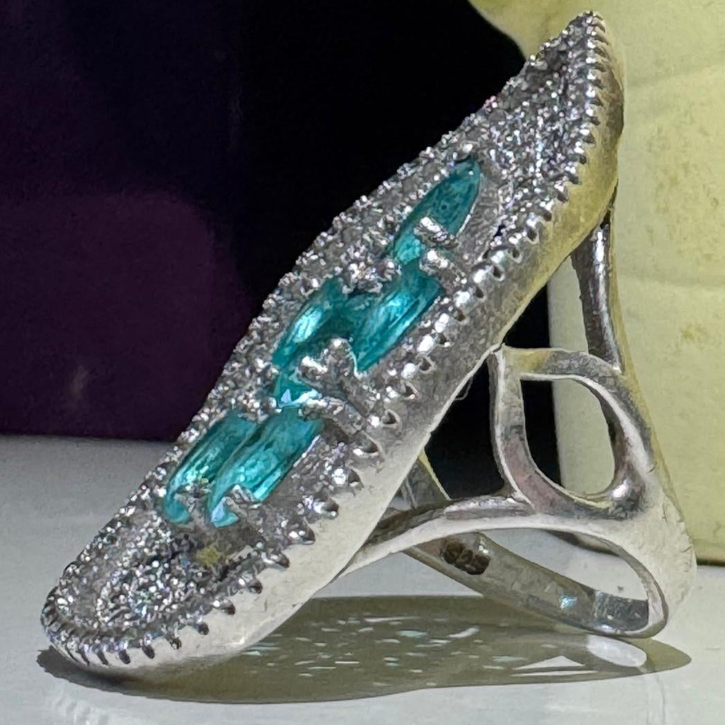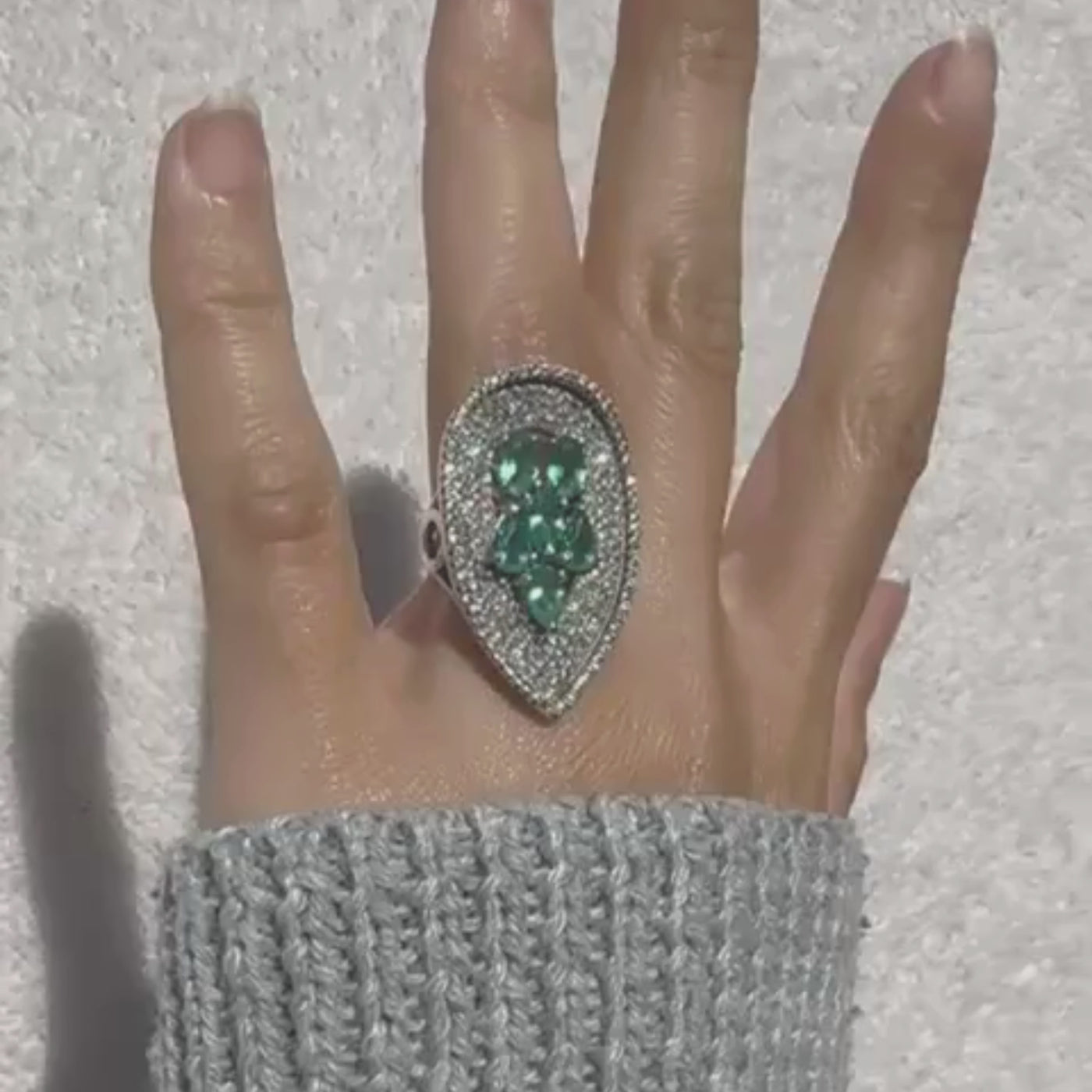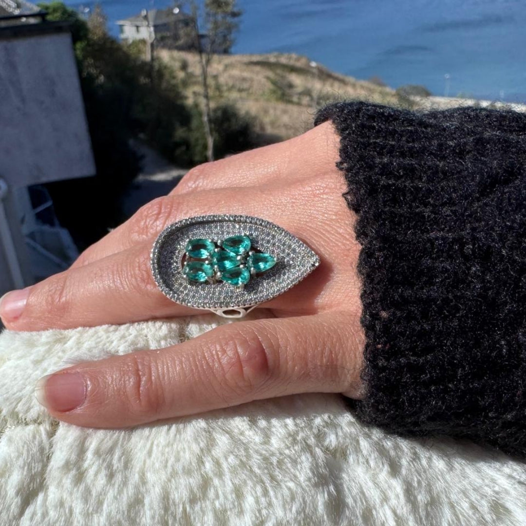 A handcrafted sculptural statement ring featuring a rare cluster of natural aquamarine gemstones, shimmering in pure ocean hues. Each stone is expertly cut in marquise and oval silhouettes, forming a fluid composition of light and color. Surrounding the centerpiece, a halo of high-clarity pavé zircon radiates diamond-like brilliance — elevating the piece into a true work of artistry.