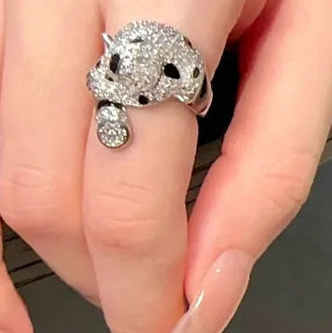 Crafted in 925 sterling silver with white gold plating, this ring embodies the mystique of the panther. Pavé-set zircon illuminates its form, while emerald-green eyes captivate. Black enamel details contrast the brilliance, creating a statement of fearless luxury.