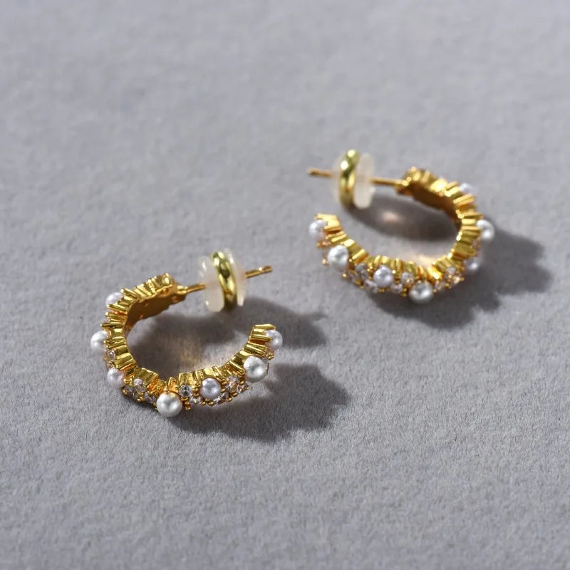 Designer C-shaped earrings plated in gold, adorned with lustrous pearls, radiant zircons, and rhinestones. Sculpted for comfort and elegance, their petite silhouette sparkles effortlessly — perfect for refined daily wear or luminous evening charm.