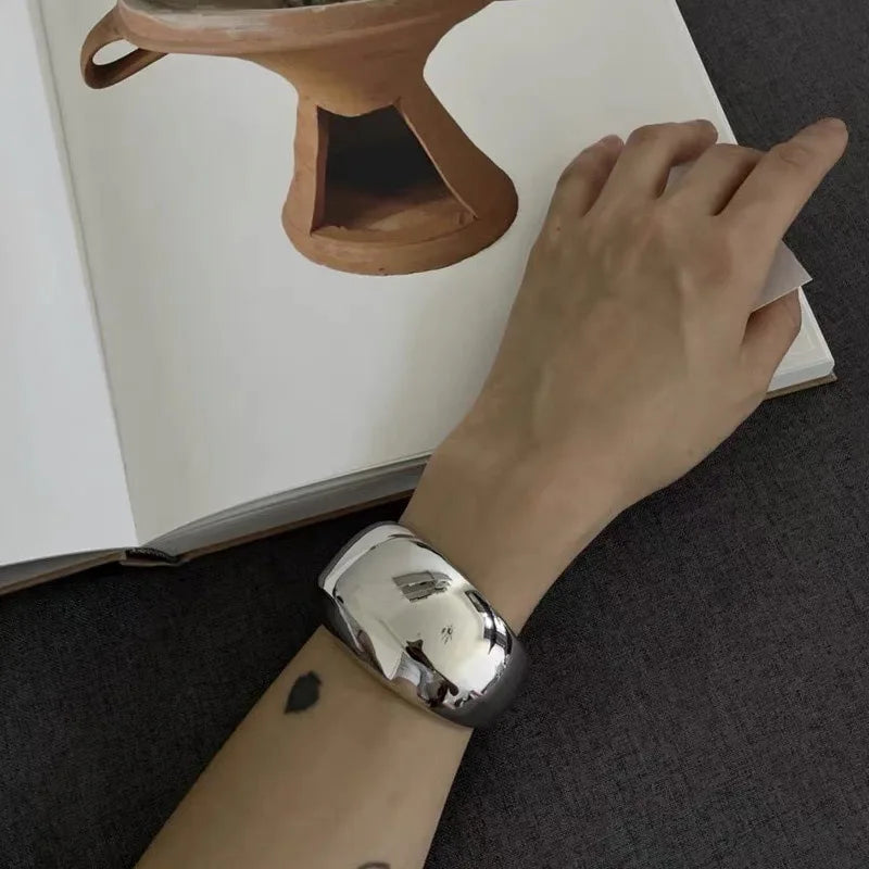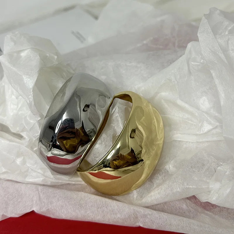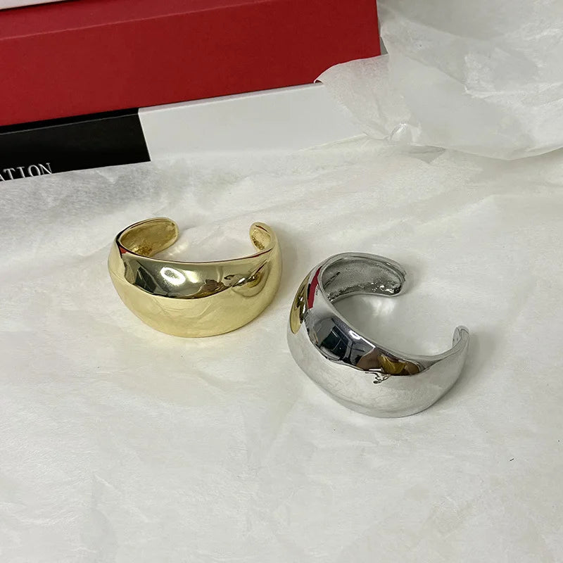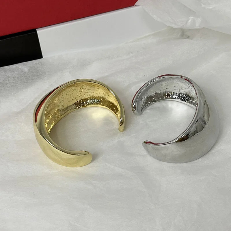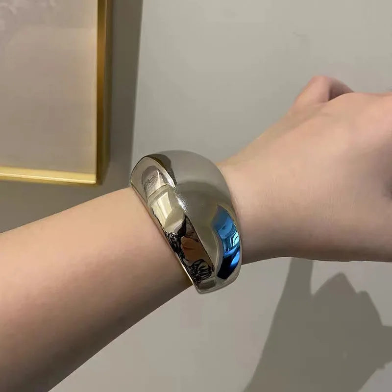 A bold yet refined bangle with soft architectural curves and a mirror-like glow. Crafted from stainless steel and titanium for enduring strength, plated in radiant gold or silver. A statement of quiet power and everyday luxury.