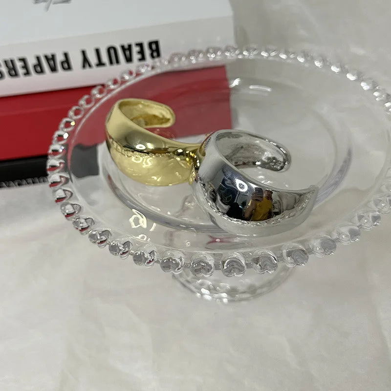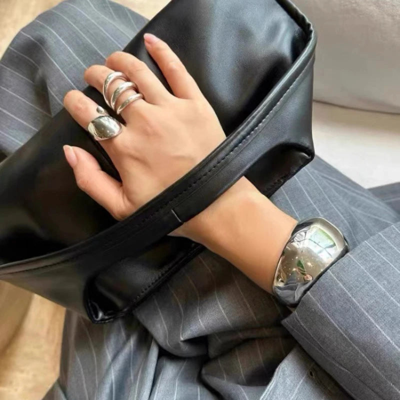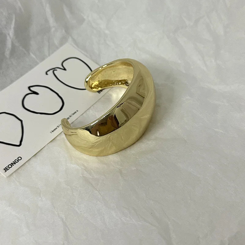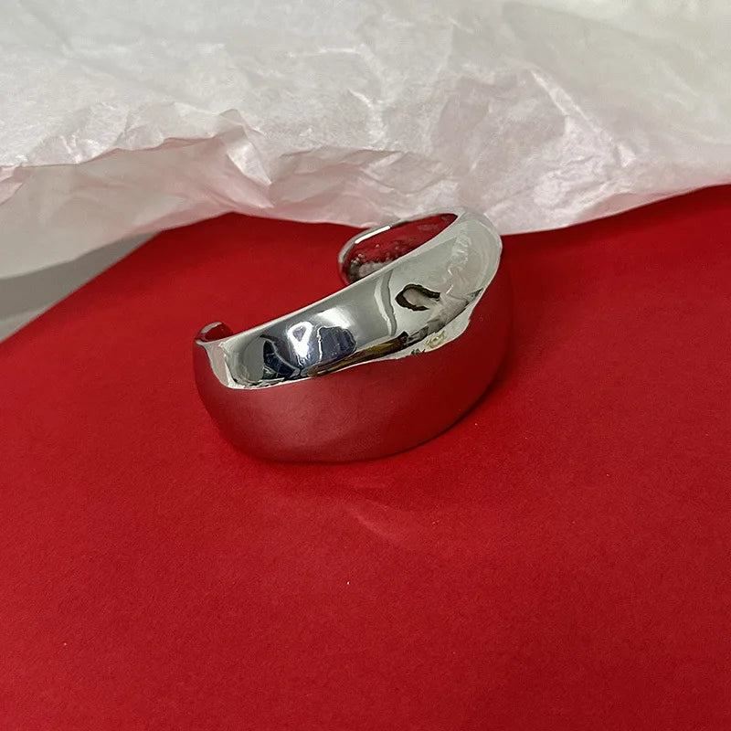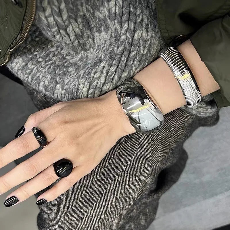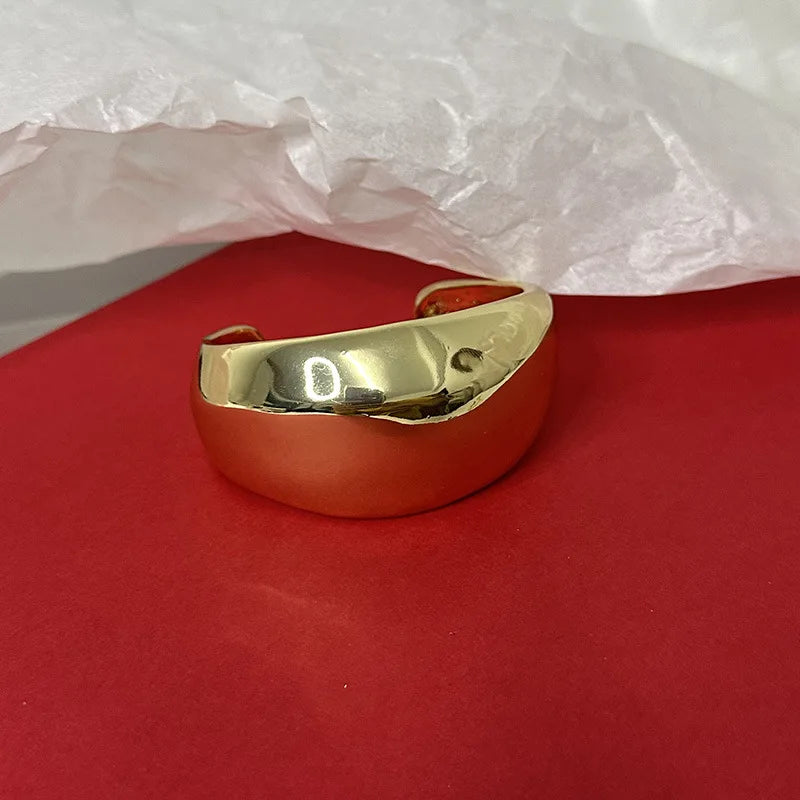 A bold yet refined bangle with soft architectural curves and a mirror-like glow. Crafted from stainless steel and titanium for enduring strength, plated in radiant gold or silver. A statement of quiet power and everyday luxury.