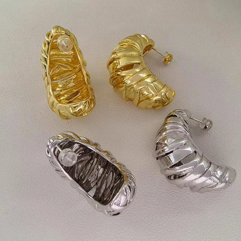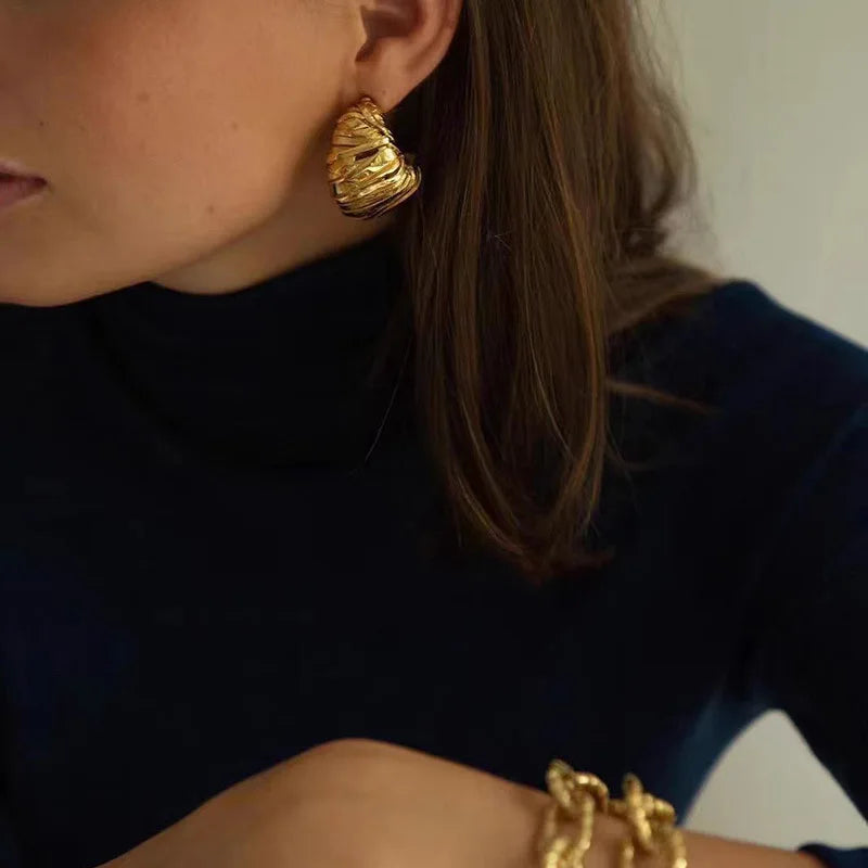 Hoop-inspired stud earrings with sculptural horn-like texture, plated in polished gold or silver. Crafted from stainless steel for lasting shine, they merge bold artistry with everyday elegance — perfect for confident, modern styling.