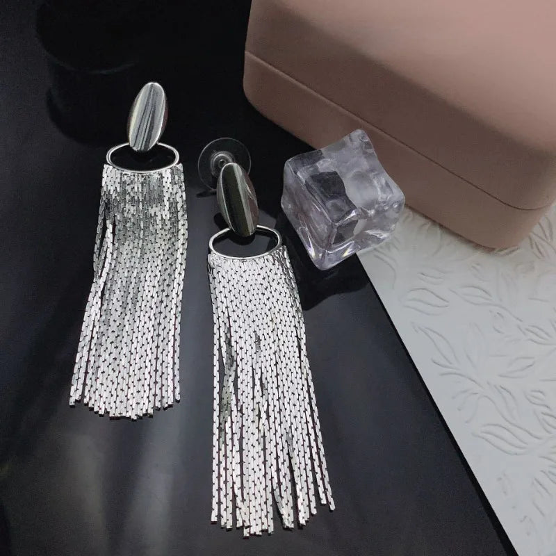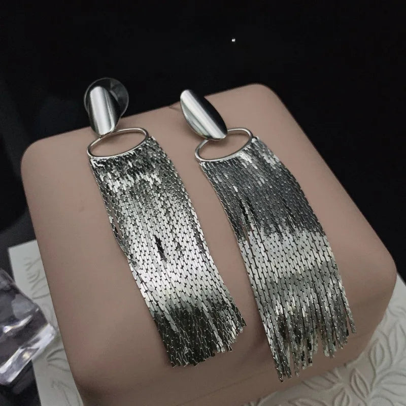 Bold and fluid, these silver tassel earrings shimmer with every movement. Crafted for nights that demand confidence, they blend lightweight comfort with daring elegance — a statement of brilliance for fashion-forward souls.