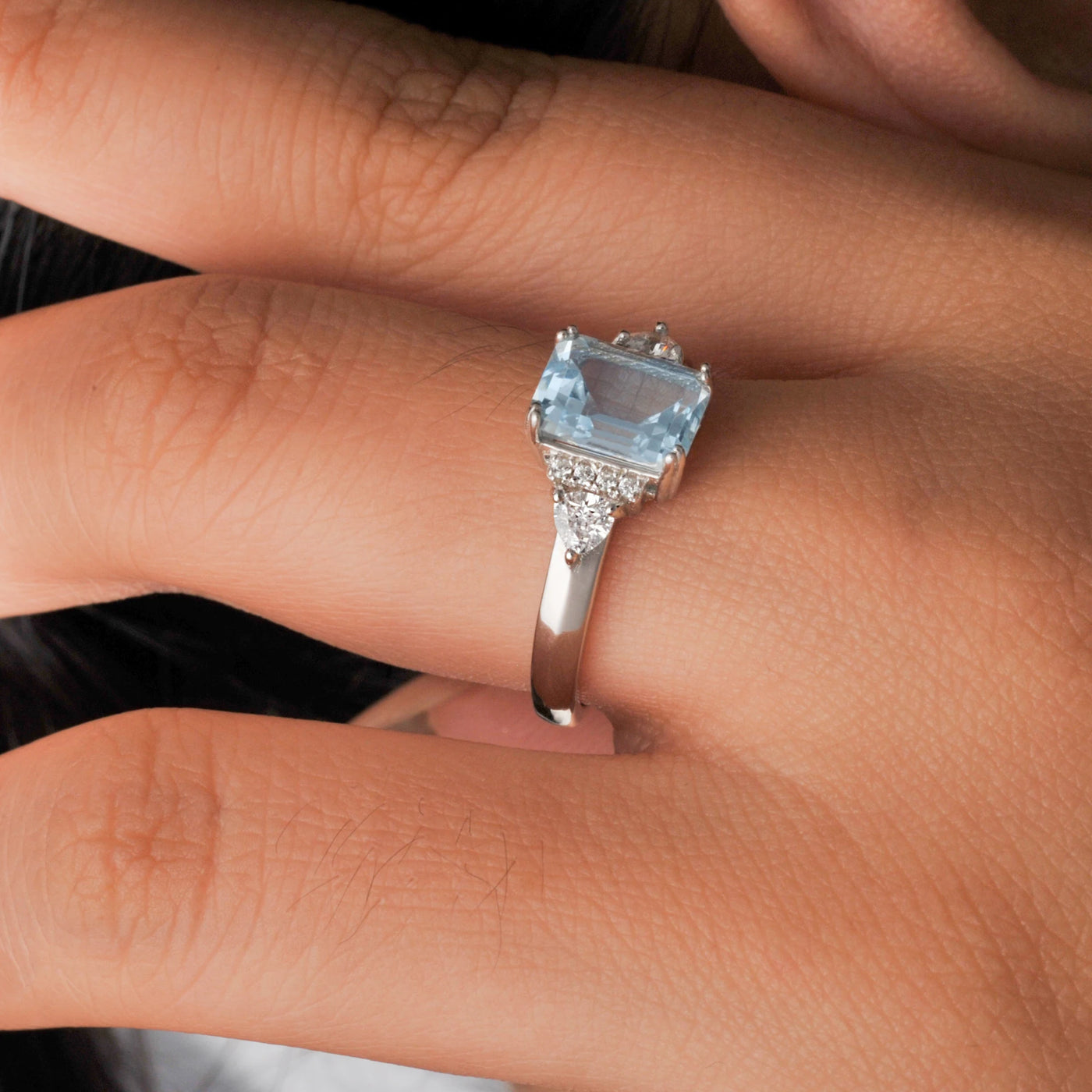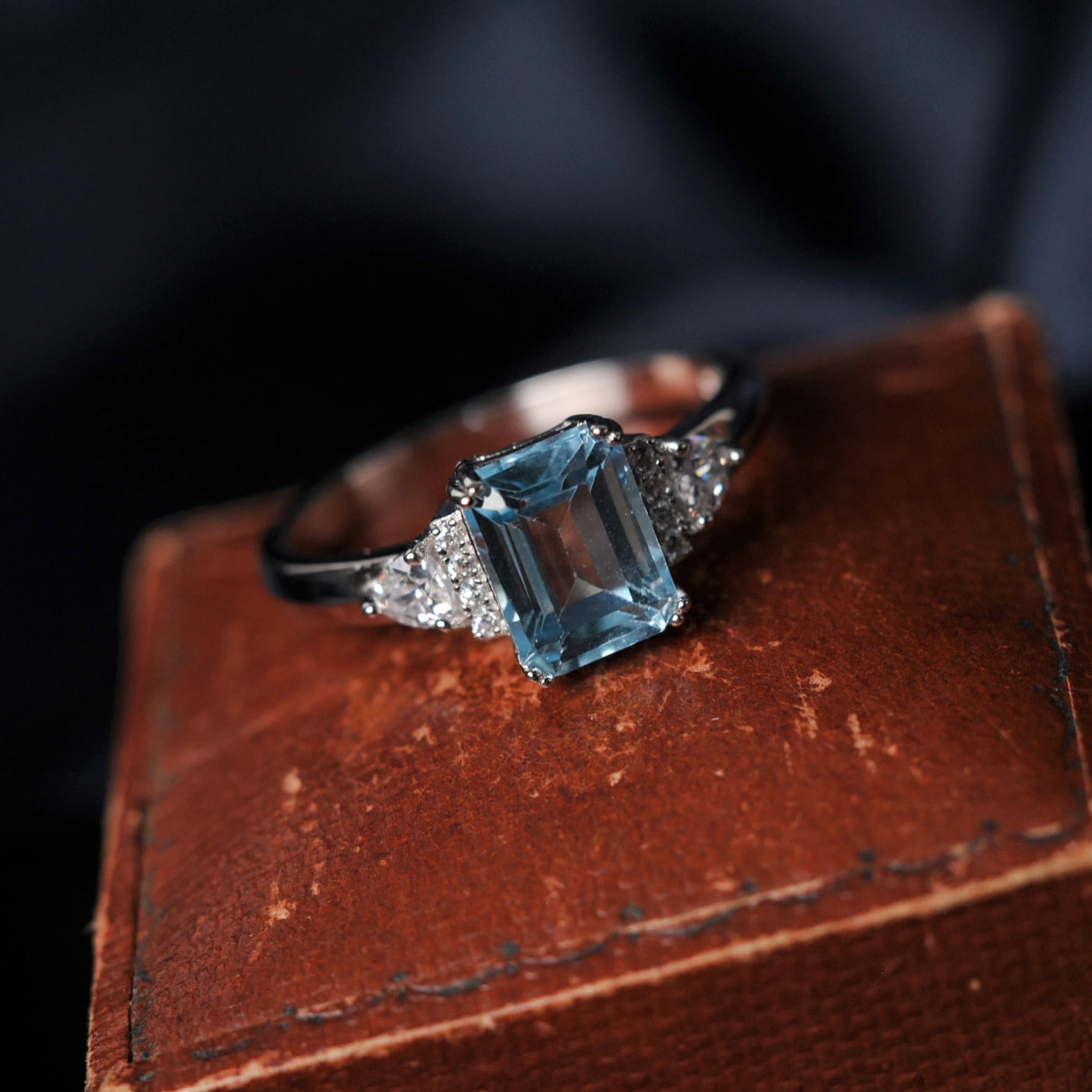 Center Stone: Natural sky blue topaz, emerald cut (8×6 mm)
