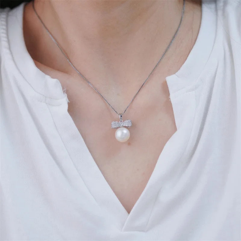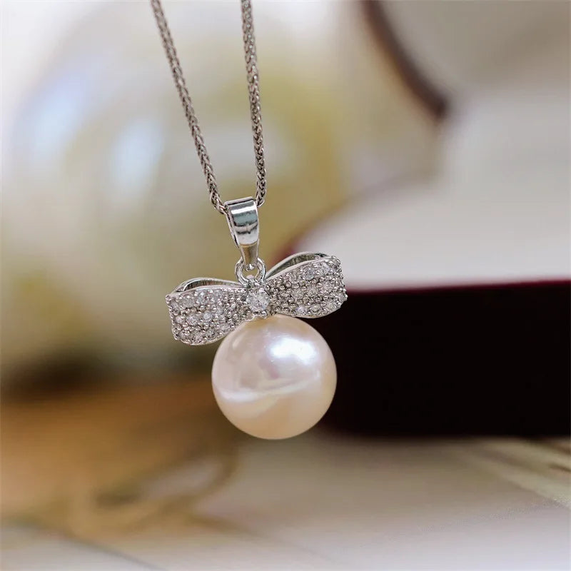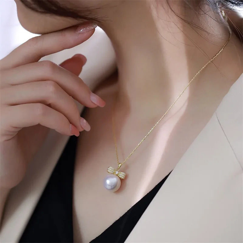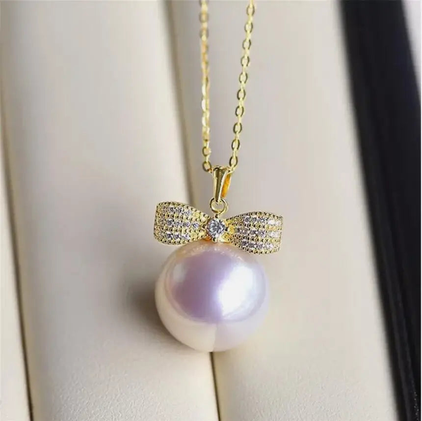 Veloura features a luminous 10–11 mm South Sea pearl topped with a pavé-set bow, shimmering with delicate stones. Suspended on a polished 925 sterling silver chain with gold finish, it embodies feminine charm and timeless elegance. Lightweight, hypoallergenic, and gift-ready. luxury with a bow.