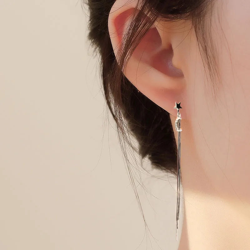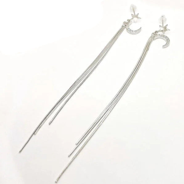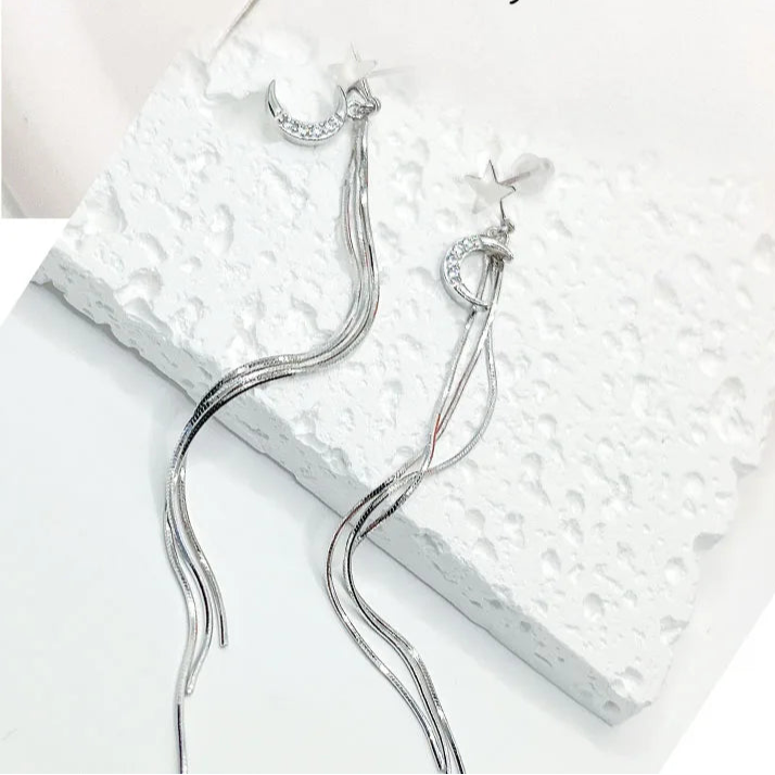 Crafted from 925 sterling silver, these long drop earrings (9.6 cm) feature star and moon motifs with chrome diopside accents. Snake-bone chain tassels add fluid movement, while the lightweight 3.3 g design ensures effortless wear with luminous sophistication.
