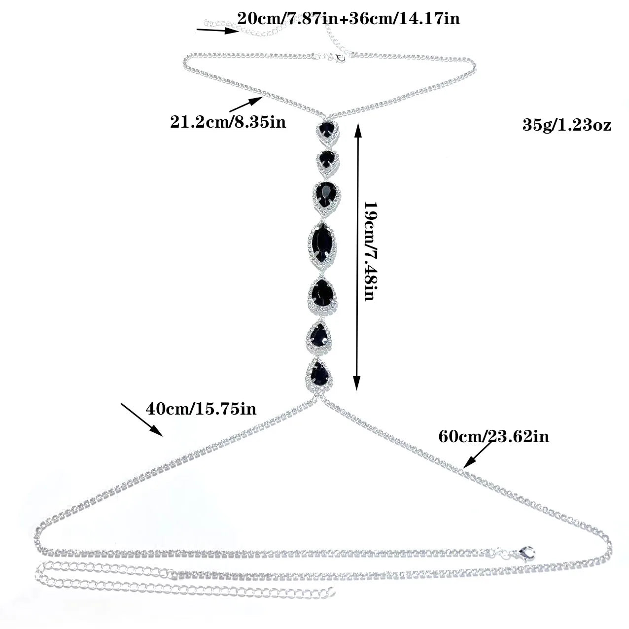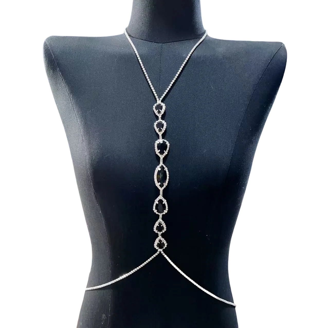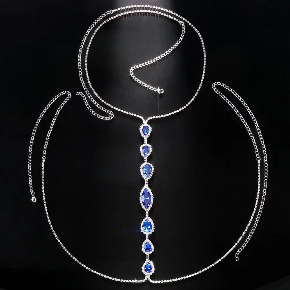 This elegant body chain drapes the torso with precision-cut teardrop crystals, glowing in midnight black or oceanic blue. Lightweight yet striking, it frames the silhouette with fluid allure — perfect over evening dresses, swimsuits, or daring layered looks.