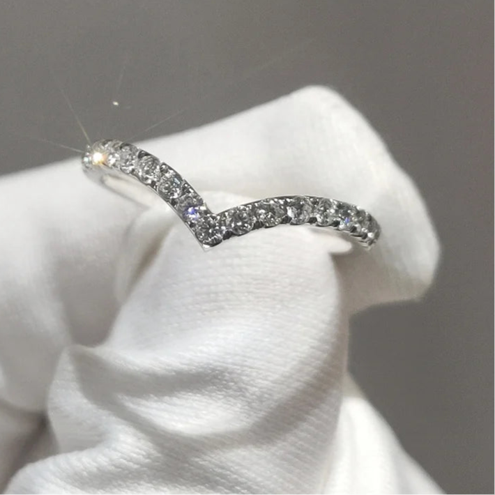 Crafted in solid 10K or 14K white gold, this V-shaped ring shimmers with 0.3CT total of D-color VVS1 micro moissanite. GRA certified and prong-set for maximum sparkle, it is sleek, symbolic, and stackable — a jewel of modern elegance and quiet strength.