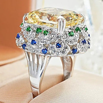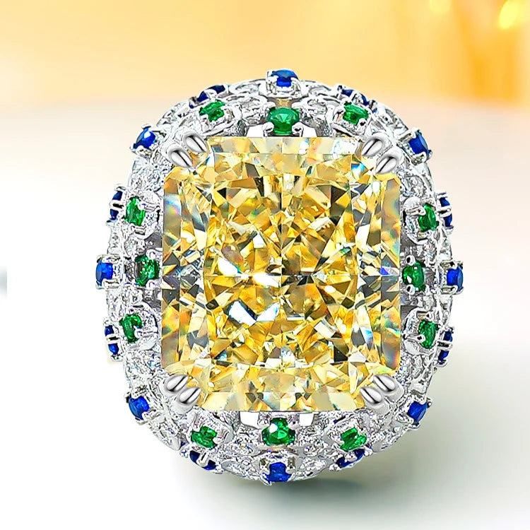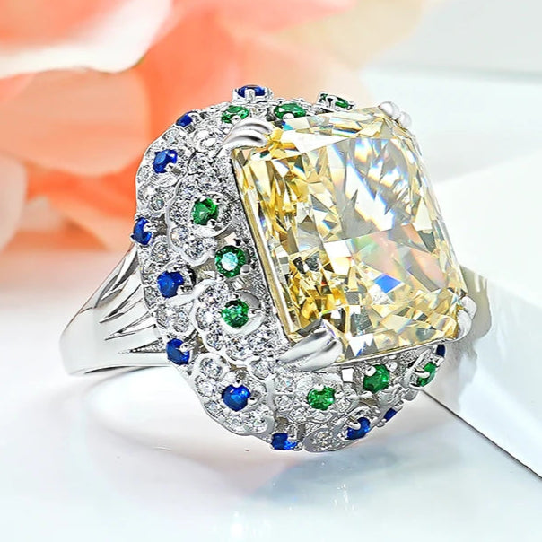 Imperial Radiance celebrates the majesty of light — handcrafted in rhodium-plated 925 silver, crowned with a natural yellow zircon of radiant cut brilliance. Blue and green micro accents bring harmony to its golden glow, evoking regal energy in every facet.