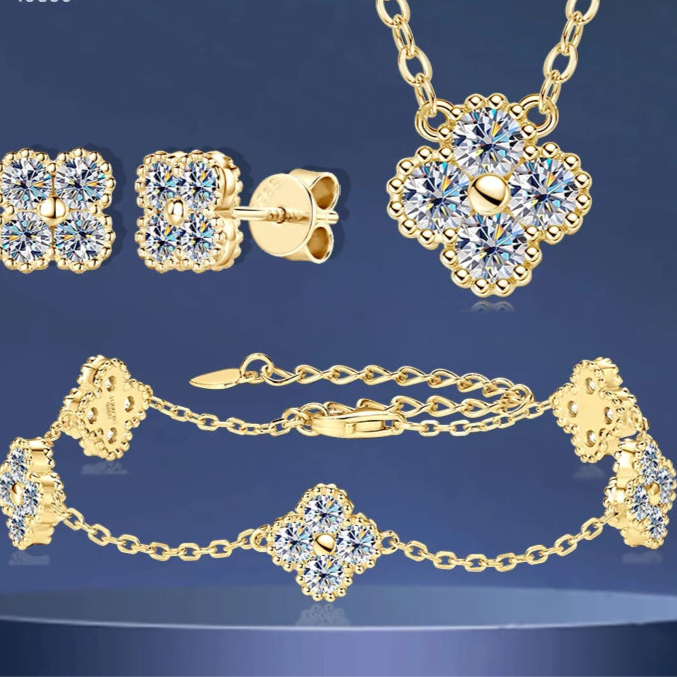 Her parça, 3 mm boyutunda D rengi moissanite taşlarla parıldar ve dört yapraklı klover tasarımıyla şansın ve asaletin simgesi haline gelir.