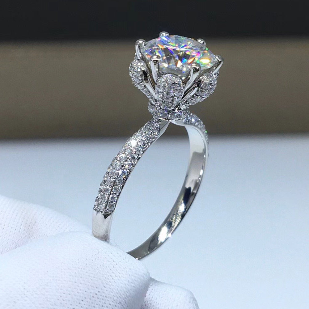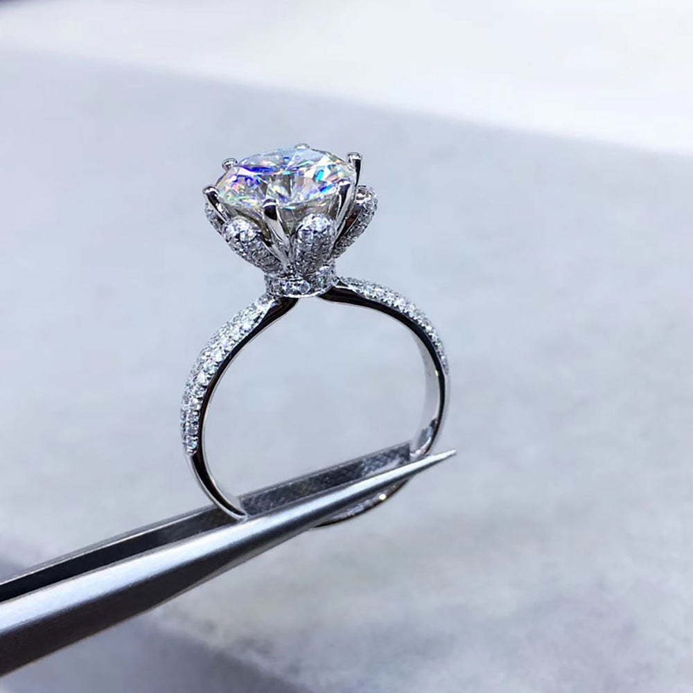 S925 gümüşten üretilip 18K beyaz altın kaplanan bu yüzük (~3 g), merkezde 1 veya 2 karat D renk VVS1 moissanite taşıyla ışıldar. Çiçek formunda pavé halo ve taşlı bant tasarımıyla tamamlanmıştır. GRA sertifikalı ve elmas testinden geçmiştir.