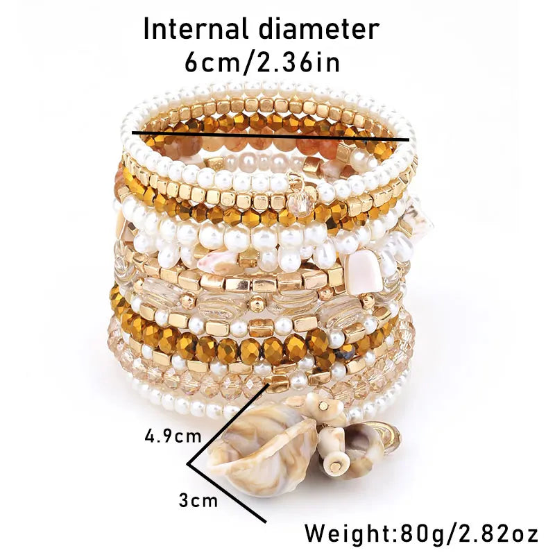 Cam boncuklar, inci detayları ve deniz kabuğu charm’larıyla tasarlanmış çok katmanlı bileklik seti. Hafif ve esnek yapısıyla sahilden yaz akşamlarına şıklık katar.