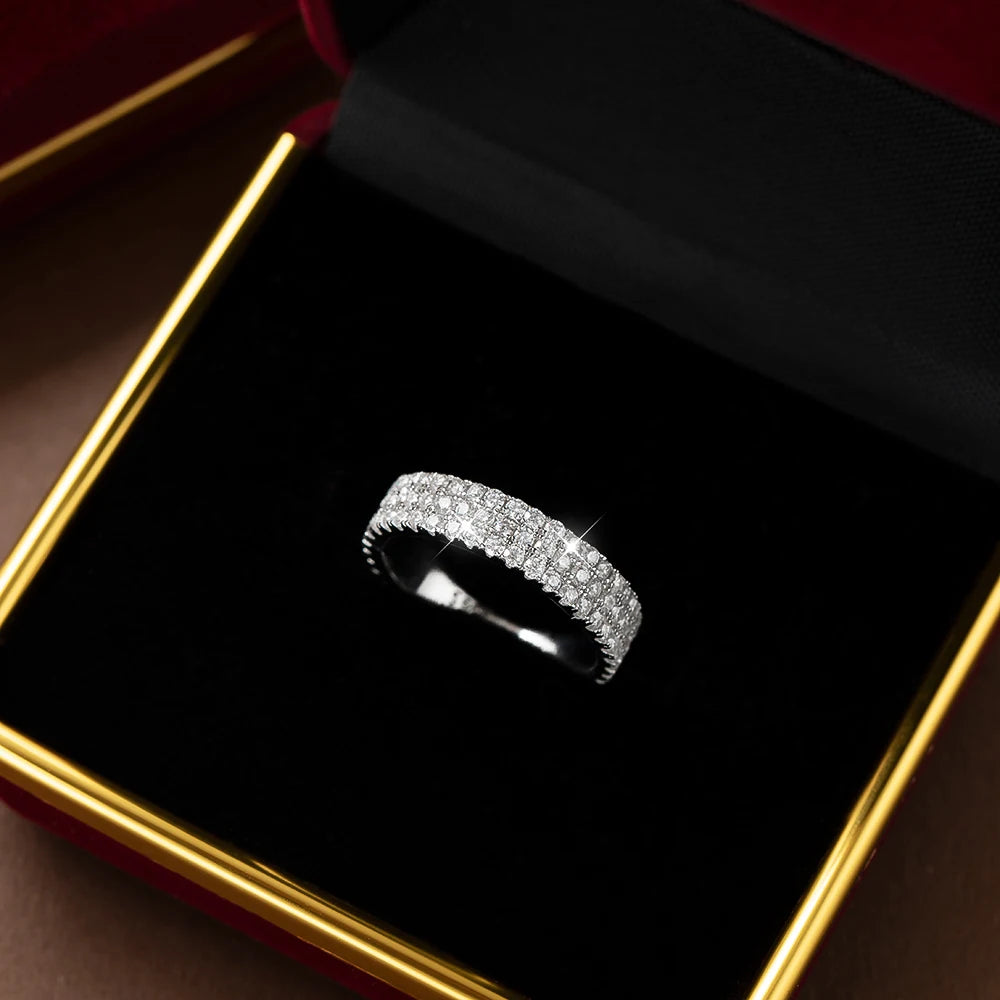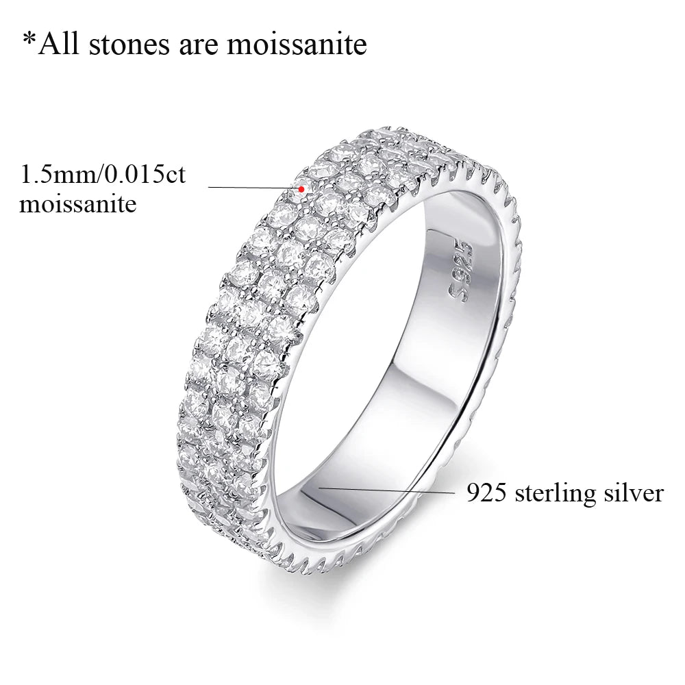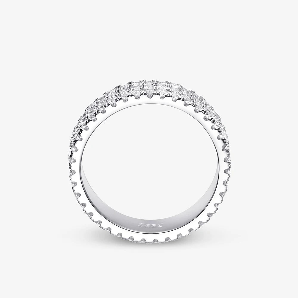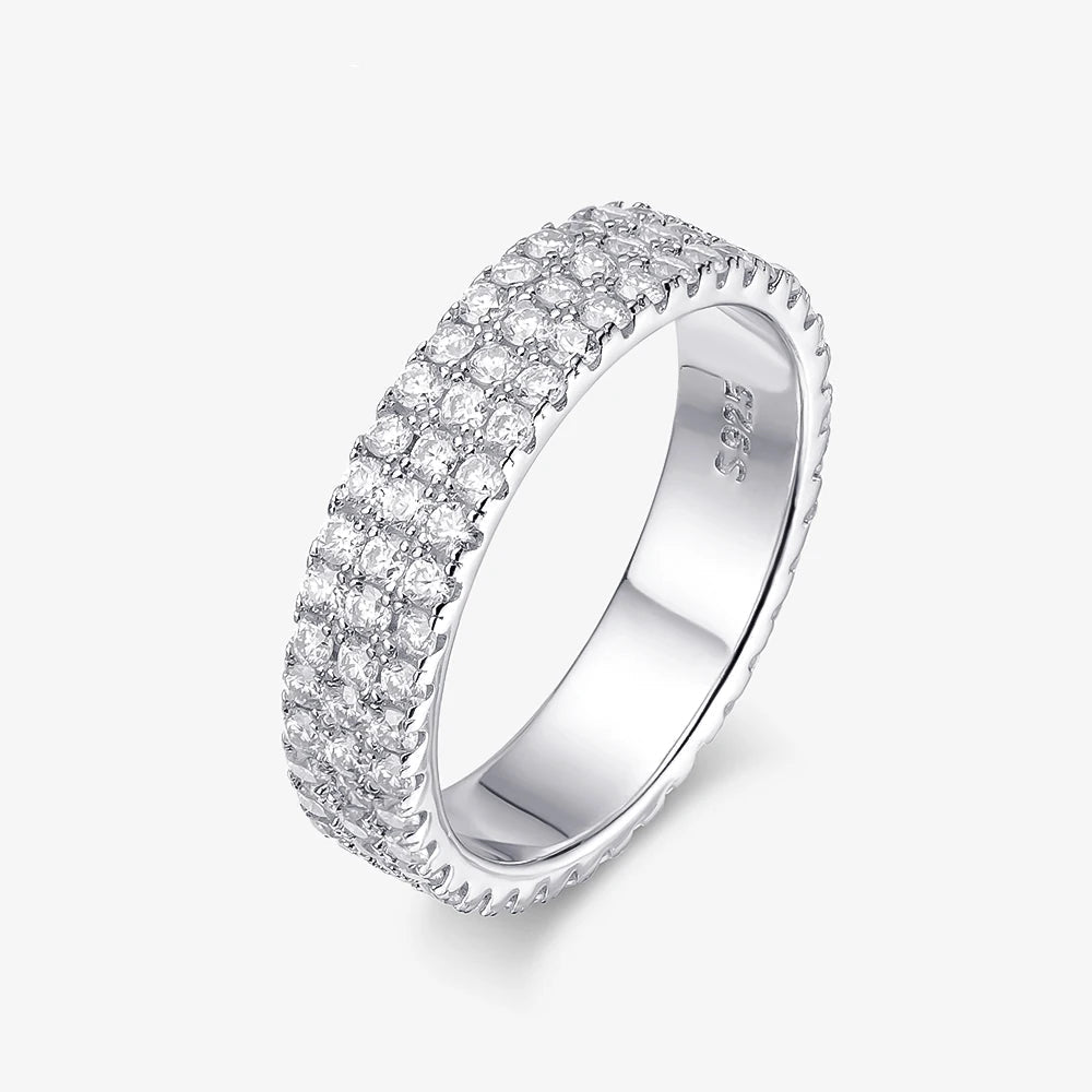 Tamamen 925 ayar gümüşten üretilen bu eternity yüzük, D-Color VVS berraklık moissanite taşlarla (GRA sertifikalı) işlenmiştir. Ayna parlaklığında yüzey ve pençe montür sayesinde her 1.5 mm taş elmas benzeri bir ışıltı saçar. 4.5 mm genişliğiyle rahatlığı ve cesur lüksü bir arada sunar.