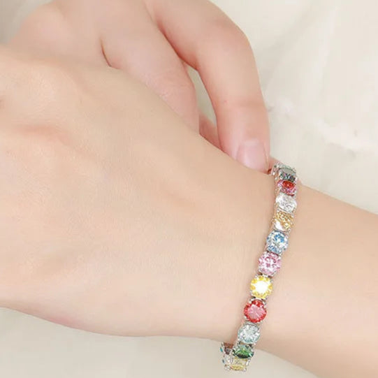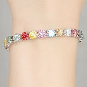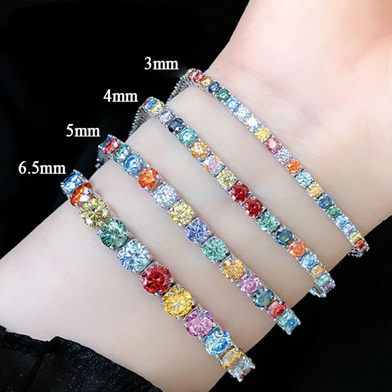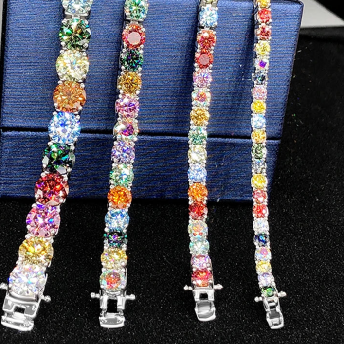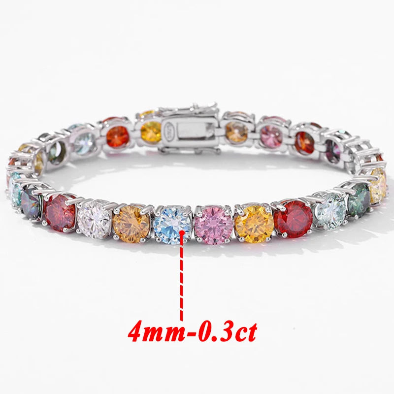 925 ayar gümüşten üretilen ve altın kaplama ile tamamlanan bu tenis bilezik, GRA sertifikalı gökkuşağı moissanite taşlarıyla süslendi. 3 mm, 4 mm, 5 mm veya 6.5 mm seçenekleriyle ~5 g hafifliğiyle zarif ve günlük şıklık için mükemmel.