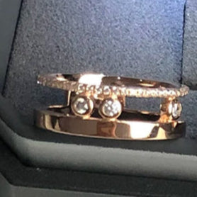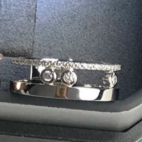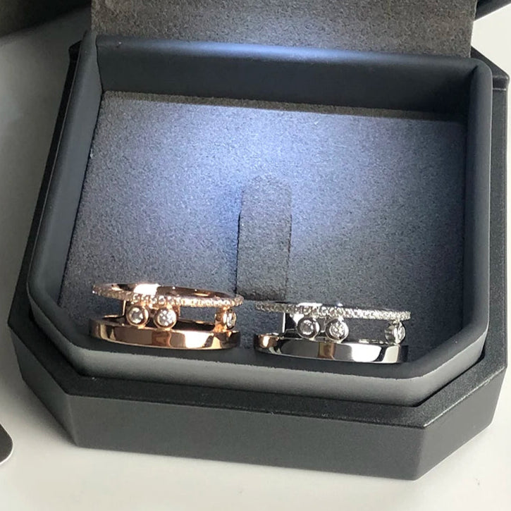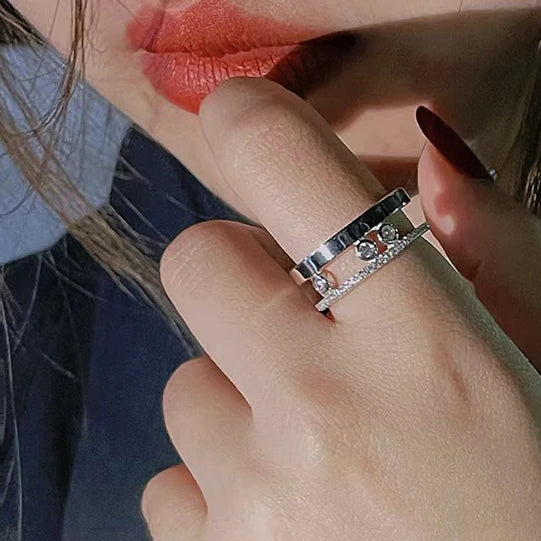 Sertifikalı S925 ayar gümüşten üretilen bu yüzük, hareket eden üç zirkon taşıyla ışıldar. ~1 g hafifliği ve modern çift bantlı tasarımıyla hem zarif hem de duygusal bir şıklık sunar. Düğün veya sembolik aşk yüzüğü olarak mükemmel bir seçimdir.