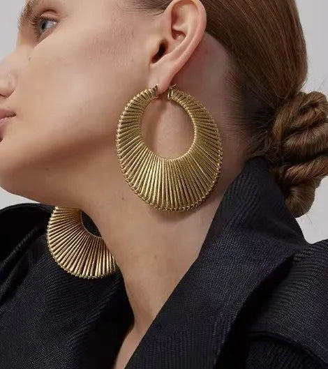 Altın veya gümüş kaplama, dokuma esintili büyük halka küpeler. Heykelsi hacmiyle iddialı bir görünüm sunar; hafif yapısıyla konforlu, şıklığıyla göz kamaştırıcı. Modern tarz ve özel davetler için kusursuz bir statement parça.